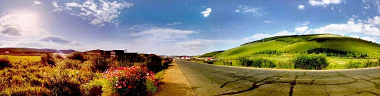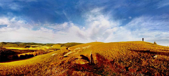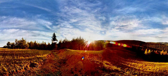 可見,全景照片的拍攝和拼接都比普通攝影困難一些,這是全景的難點,但這也是全景的亮點。全視角的顯示不僅給人以開闊,空靈的感覺,而且全頻譜記錄了拍攝場景的構圖,色彩,明暗與層次,與普通攝影比較起來具有更加豐富的藝術元素,從而表達某種藝術主題。比如日出和日落,你在全景照片中不僅可以看到面對太陽的日出日落景色,而且也可以在背對太陽地一面看到金色陽光普照大地的絢麗色彩,從面向太陽到背向太陽的過度更是豐富多彩。請看下面兩張從全景照片截取下來的超寬全景: