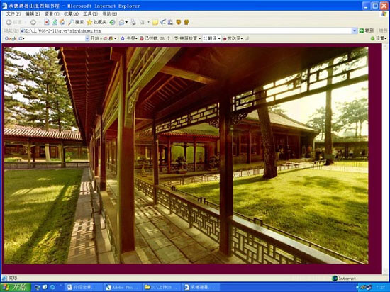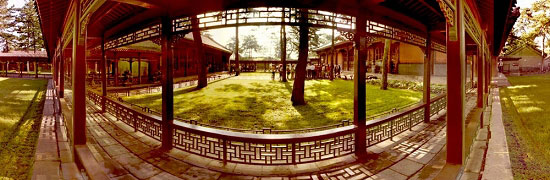 這是在承德避暑山莊的四知書屋附近的回廊拍攝的,在近距離內拍攝回廊的全景。直線的回廊完全變成了曲線,雖然失真,但卻有奇特的視覺效應。這張照片如果觀看全視角的全景,就恢復了真實場景的全貌。