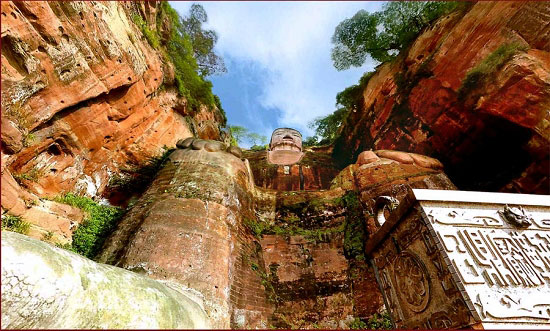 圖為向上斜視的樂山大佛全景照片的截圖,該全景是在大佛的腳下不遠的距離內拍攝,顯示了大佛的輝煌宏大。